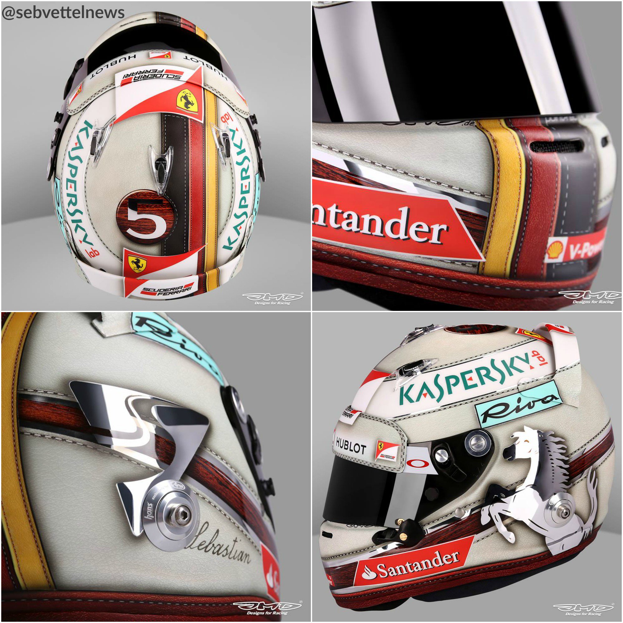 Hoorde ik op Sky F1 dat Vettel een leather look helm heeft laten maken. Inderdaad erg coole airbrush: