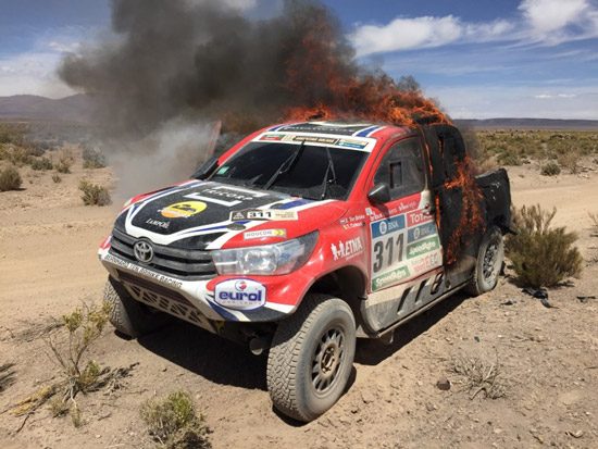 Helaas is de gisteren best geklasseerde (achtste plek overall) Nederlandse equipe, Bernhard ten Brinke en navigator Tom Colsoul, uitgevallen doordat hun auto vijftien kilometer voor de finish volledig afbrande. Vijf kilometer eerder waren ze lek gereden en het verwisselde wiel is in de laadruimte van de Toyota Pickup in brand gevlogen De vlammen verspreidden zich zo snel, dat blussen niks meer uit kon halen.