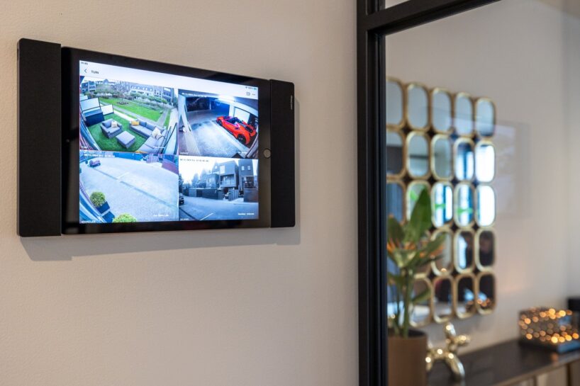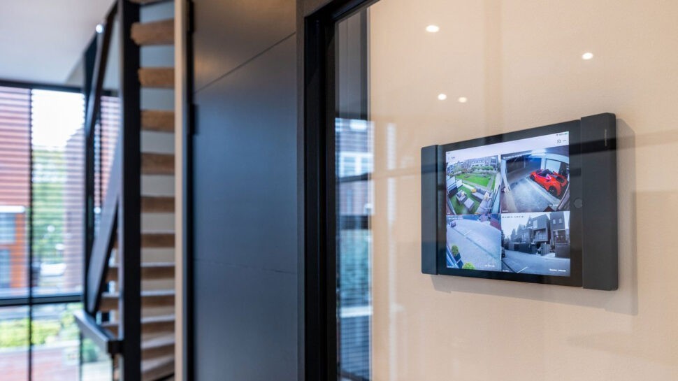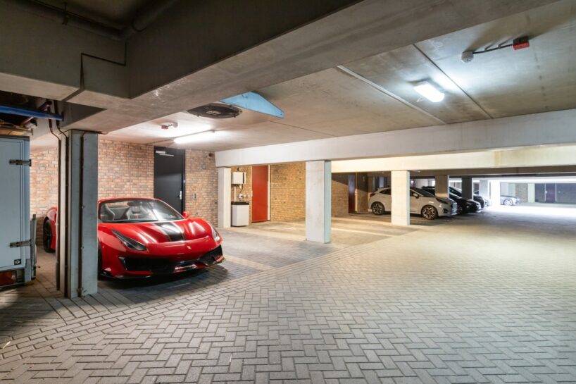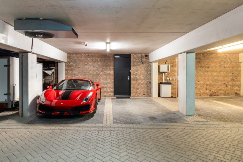 We gaan natuurlijk altijd meteen naar de garage, maar dit huis heeft geen eigen garage. In plaats daarvan heb je twee parkeerplekken in een gezamenlijke parkeergarage. Die kun je via een camera in de gaten houden vanuit de woonkamer. En op één van deze plekken zie we iets interessants staan, namelijk een hele dikke Ferrari.