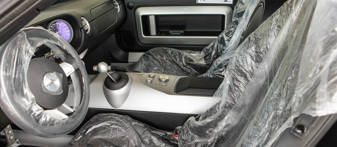 Plastic hoesjes om het stuur, plastic op de stoelen, alles. Deze Ford GT kwam 10 jaar geleden rechtstreeks uit de fabriek, daarna is er geen kilometer meer mee gereden.
