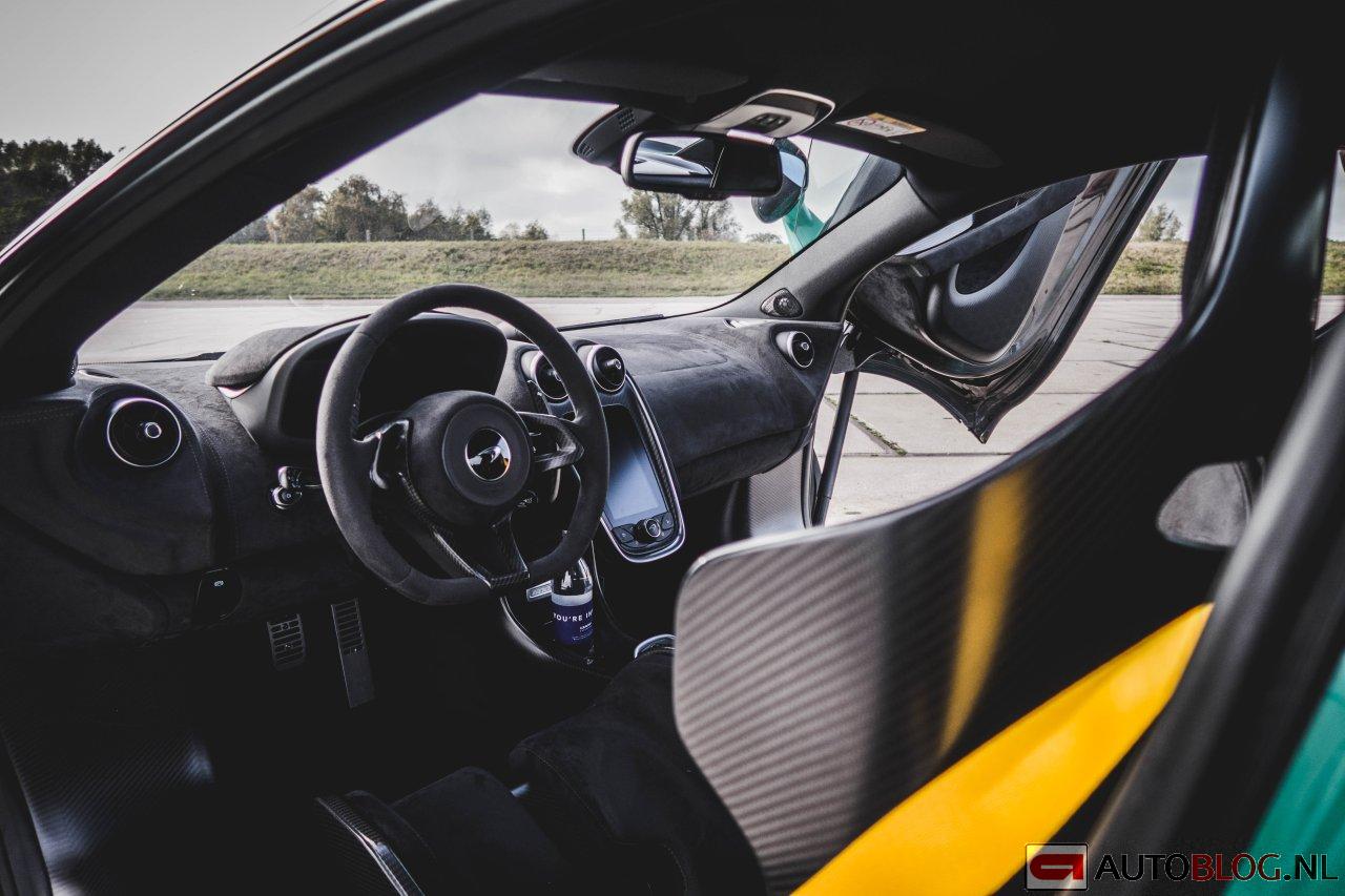 Echte winst is wel geboekt in het interieur: het geheel is afgewerkt met lichtgewicht Alcantara bekleding en door afwezigheid van tapijt op de vloer bij bestuurder en passagier is 5,7 kg bespaard. Daardoor is ook meteen de koolstofvezel constructie van het MonoCell II-chassis goed te zien. McLaren wist ook nog wat grammen te winnen door het verwijderen van het handschoenenkastje en door de opbergvakken in de portieren te vervangen door netten.