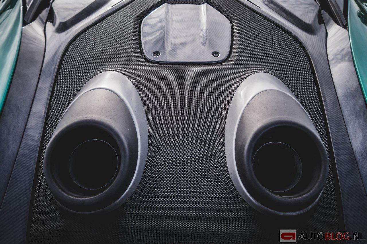 Los van een paar herschreven bitjes in het motormanagementsysteem heeft de 3,8 liter grote twinturbo V8-motor ook nog een ander uitlaatsysteem gekregen. De uitlaatgassen worden via een hooggeplaatst pijpen direct de atmosfeer ingeslingerd. Aangezien de uitlaten voor de achterspoiler zitten, zit de spoiler na een geïnspireerd ritje direct onder de zwarte uitslag. Het hooggeplaatste uitlaatsysteem is overigens nog korter dan dat van de McLaren Senna, zorgt voor minder tegendruk en kan de motor daardoor beter “ademen”.