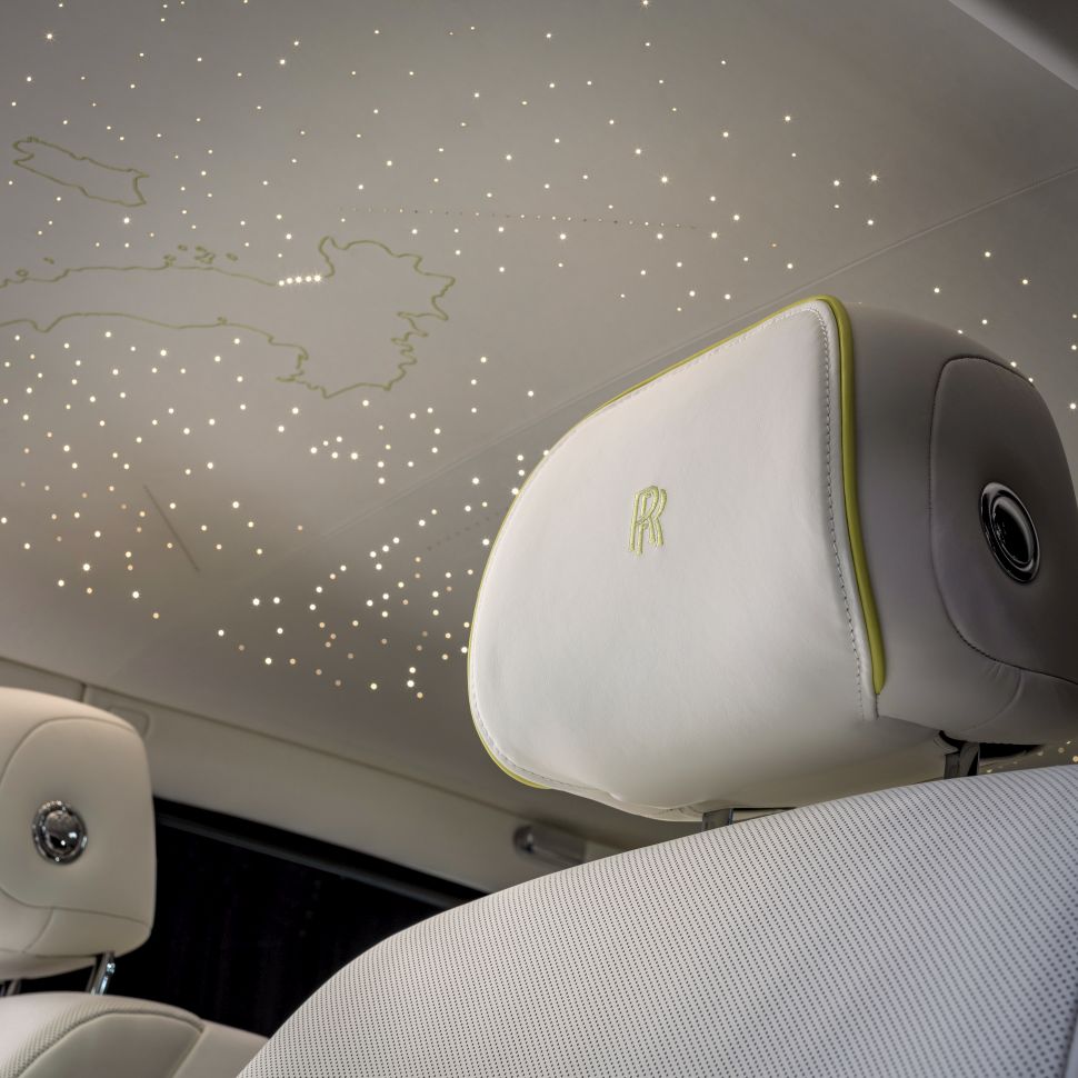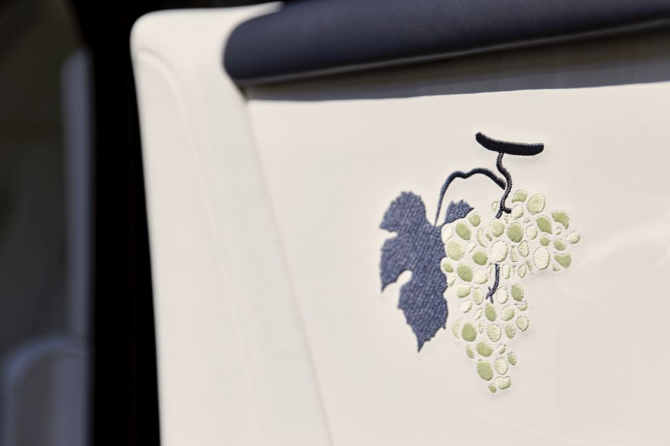 En ja, de Rolls-Royce Phantom Cinque Terre heeft dus ook een wit interieur. Hier komt ook het druivenpatroon her en der terug. Uiteraard zijn de gestikte druivenpatronen met de hand gestikt en dat kostte heel wat manuren. Het dakhemeltje bevat naast de Starlight Headliner een kaart van Italië.