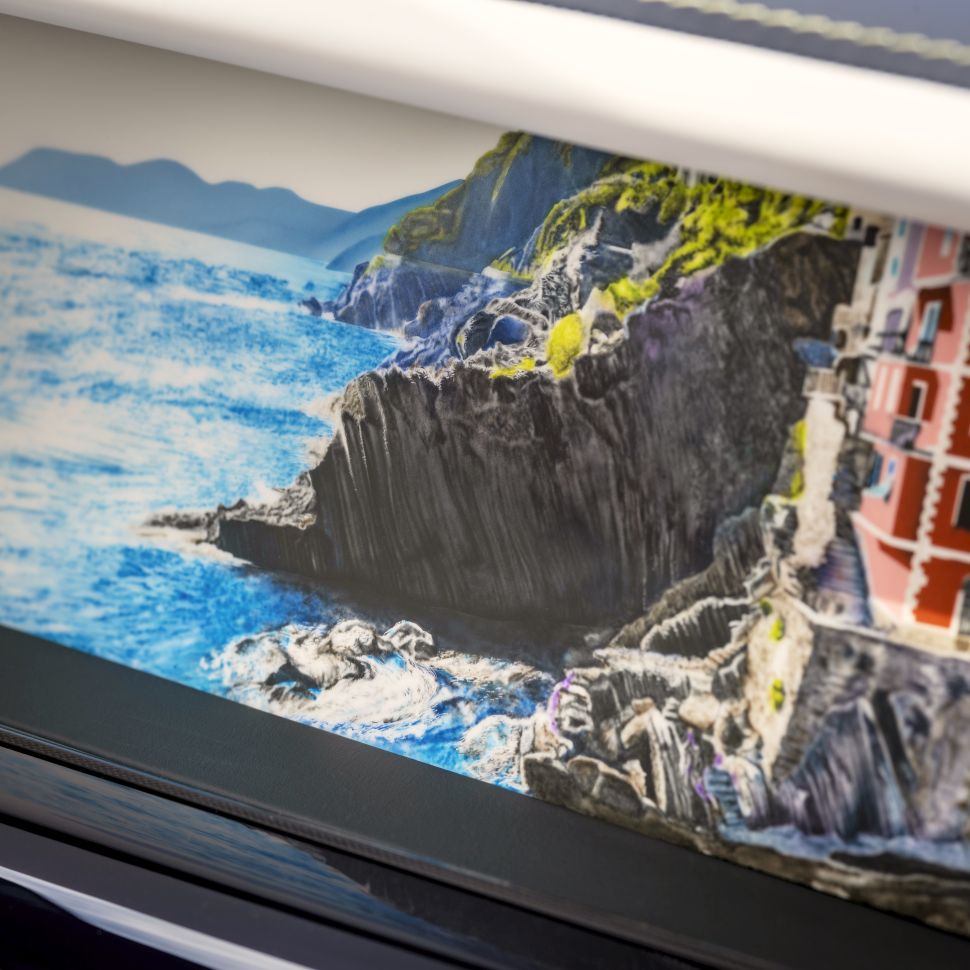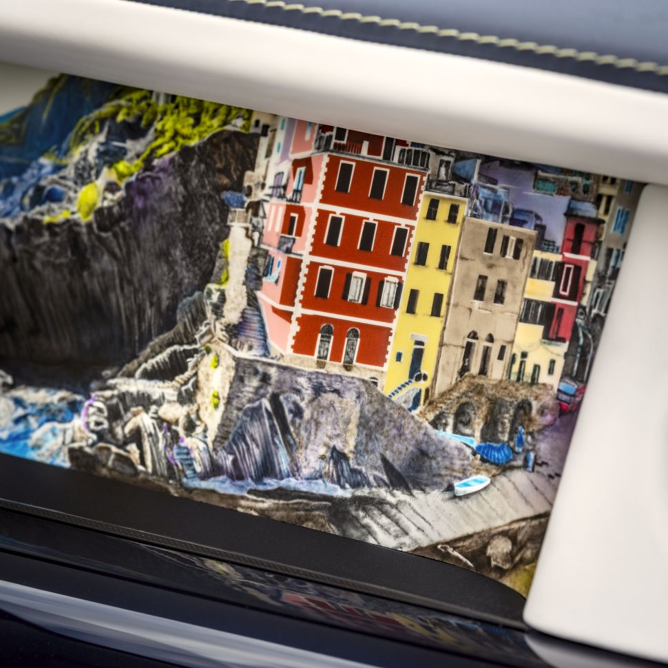 Een andere highlight van vrijwel elk Phantom-interieur is natuurlijk de galerij. Het gedeelte voor de passagier in het dashboard kan gebruikt worden voor een kunststuk of ander soort interessant visueel item. In dit geval een soort schilderij van Cinque Terre.