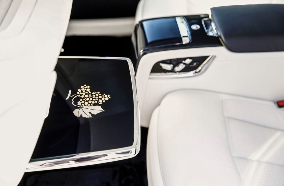 Het vertaalt zich naar de Phantom qua exterieur middels donkerblauwe lak. Dat is het eigenlijk. De met de hand geverfde schouderlijn is half Navy Blue en half Jasmine, met boven de voorste wielkast nog een tekening van een tros druiven. Dat laatste is een hommage aan de Toscaanse wijncultuur en komt op meerdere plekken terug in de Phantom.