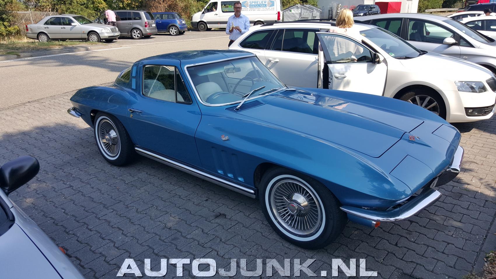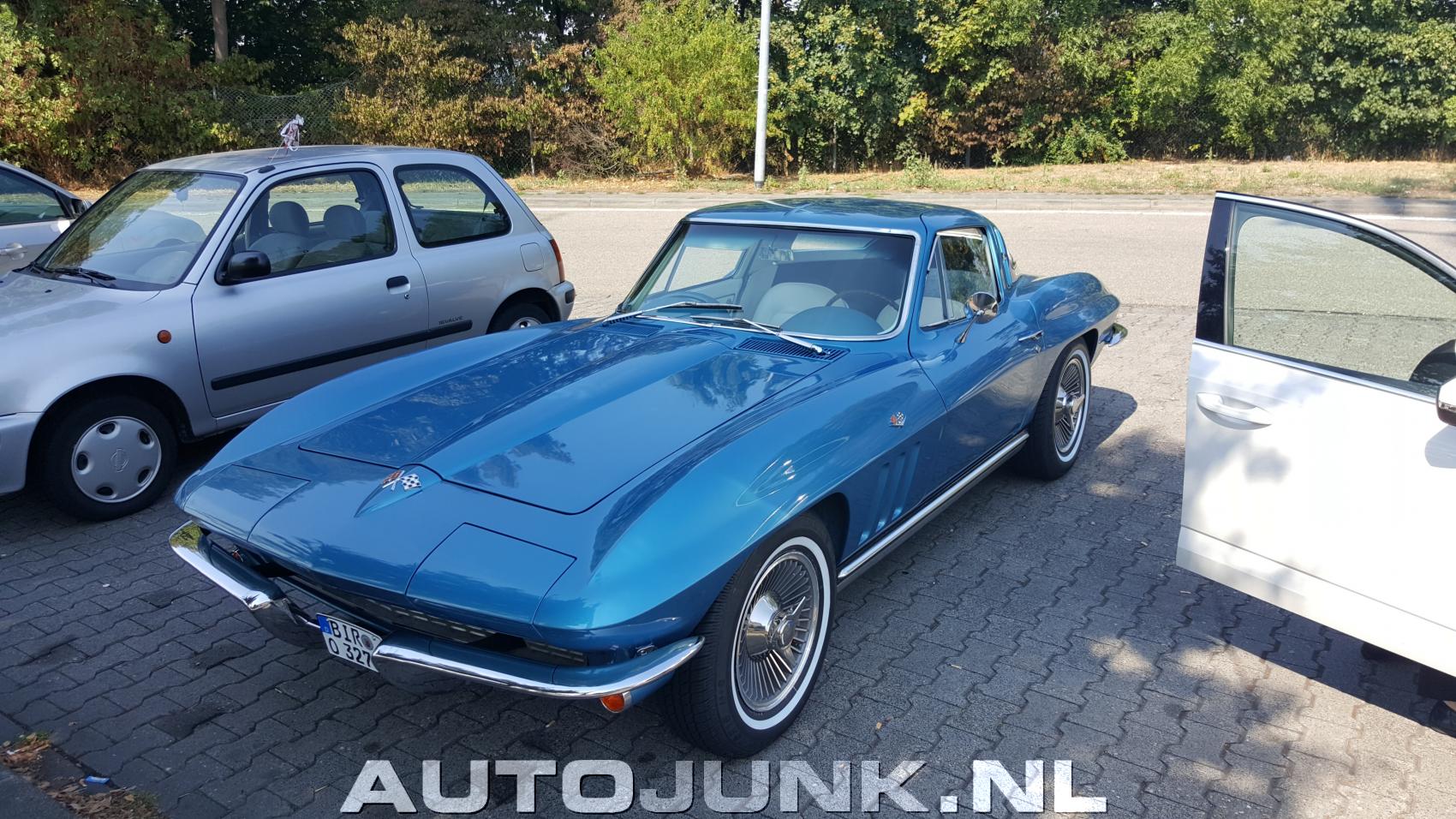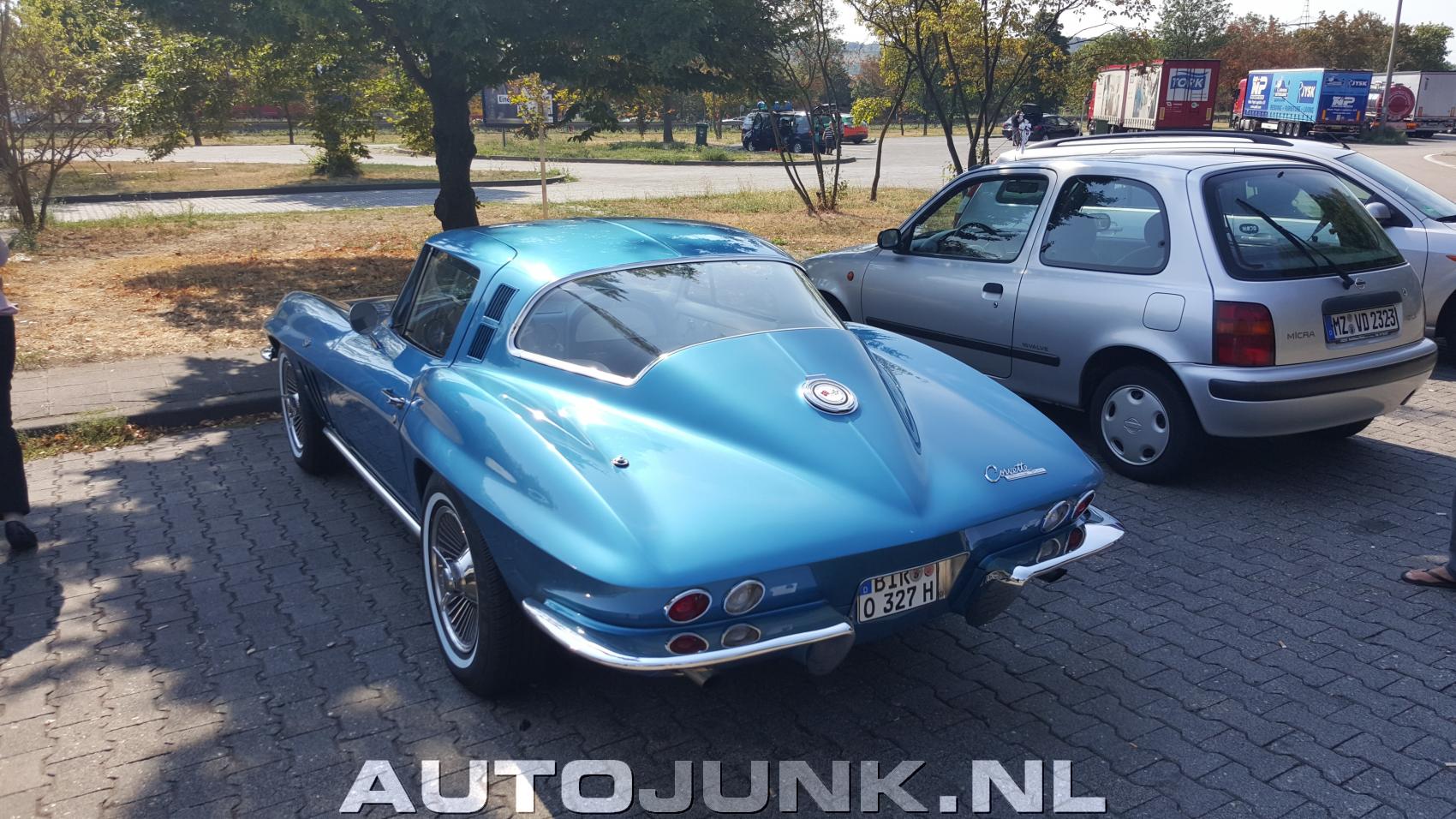 Blauwe Corvette stingray op parkeerplaats naast de autobahn bij Mainz