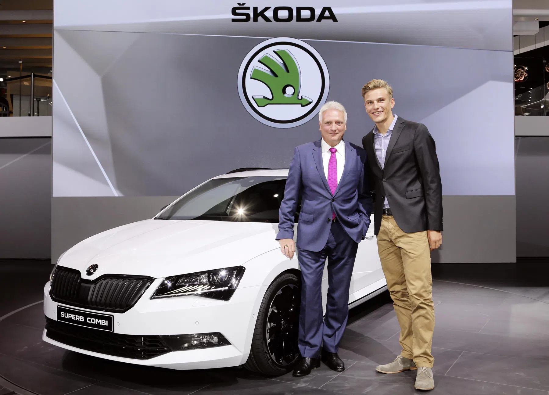 De wielrenner en de CEO. Bij de nieuwe Superb Combi op de internationale autoshow (IAA) in Frankfurt. Samen met de Duitse profwielrenner Marcel Kittel presenteerde ŠKODA CEO Prof. Dr. hc Winfried Vahland de nieuwe Combi voor het eerst aan het publiek.