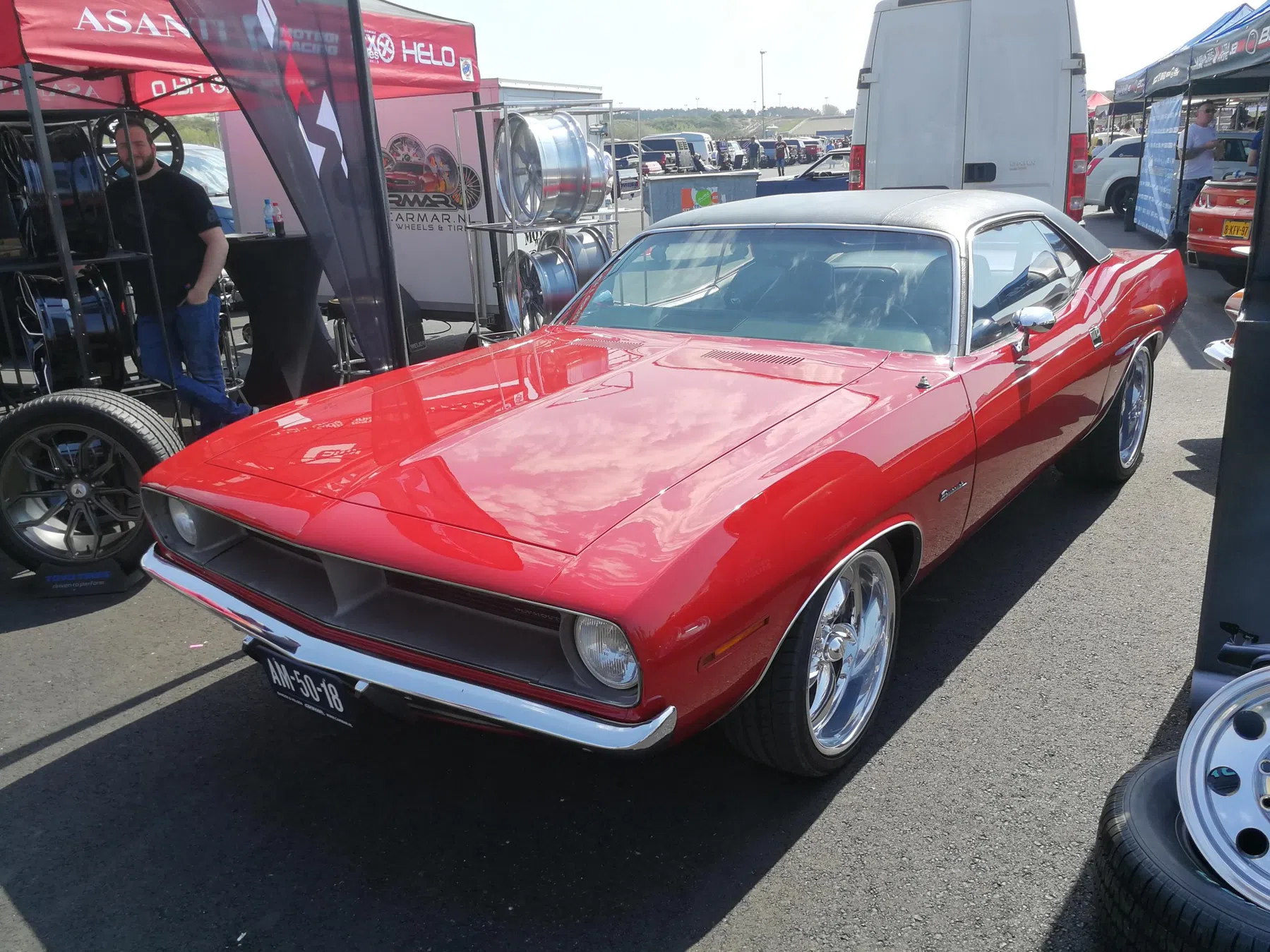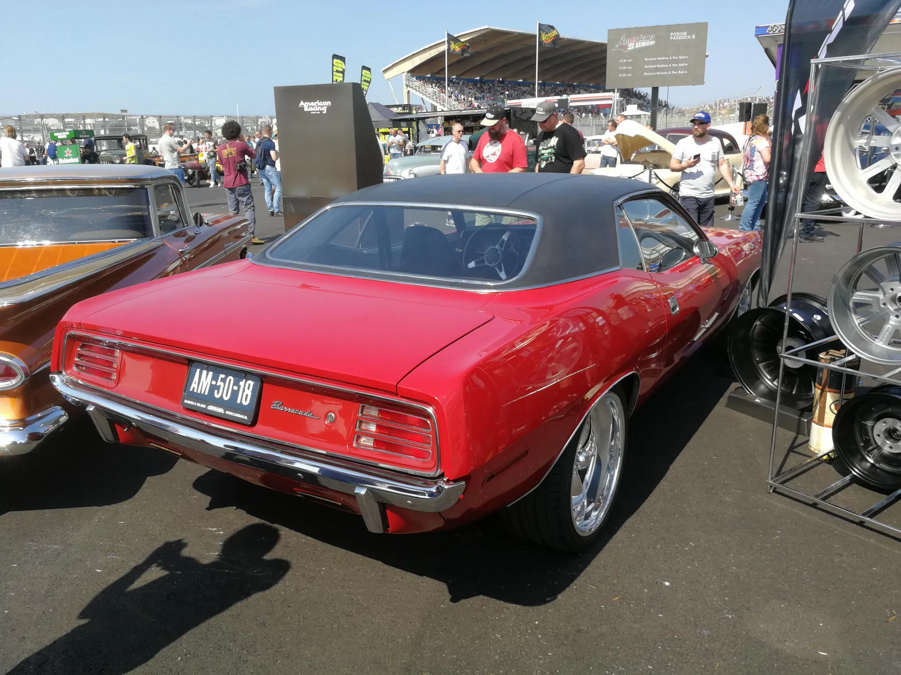 Toch wel zonde: Hoewel de Barracuda eigenlijk net wat eerder geintroduceerd werd dan de Mustang, heeft de Cuda ' nooit echt' de status enzo gekregen als dat de Mustang die nu heeft. Al na 10 jaar was t over en sluiten voor de Cuda, met dank aan de oliecrisis van '73 en omdat moeder Chrysler in die 70s niet de middelen/geld had om die tijd goed te overleven. Op American Sunday heb ik een Barracuda kunnen spotten. Eentje uit 1970 met de 5.2 liter V8: 230pk. Een prima uitvoering tbh, maar helaas zitten er niet zo fijn op t oog liggende American Racing velgen onder. Dat kon beter op gelost worden.