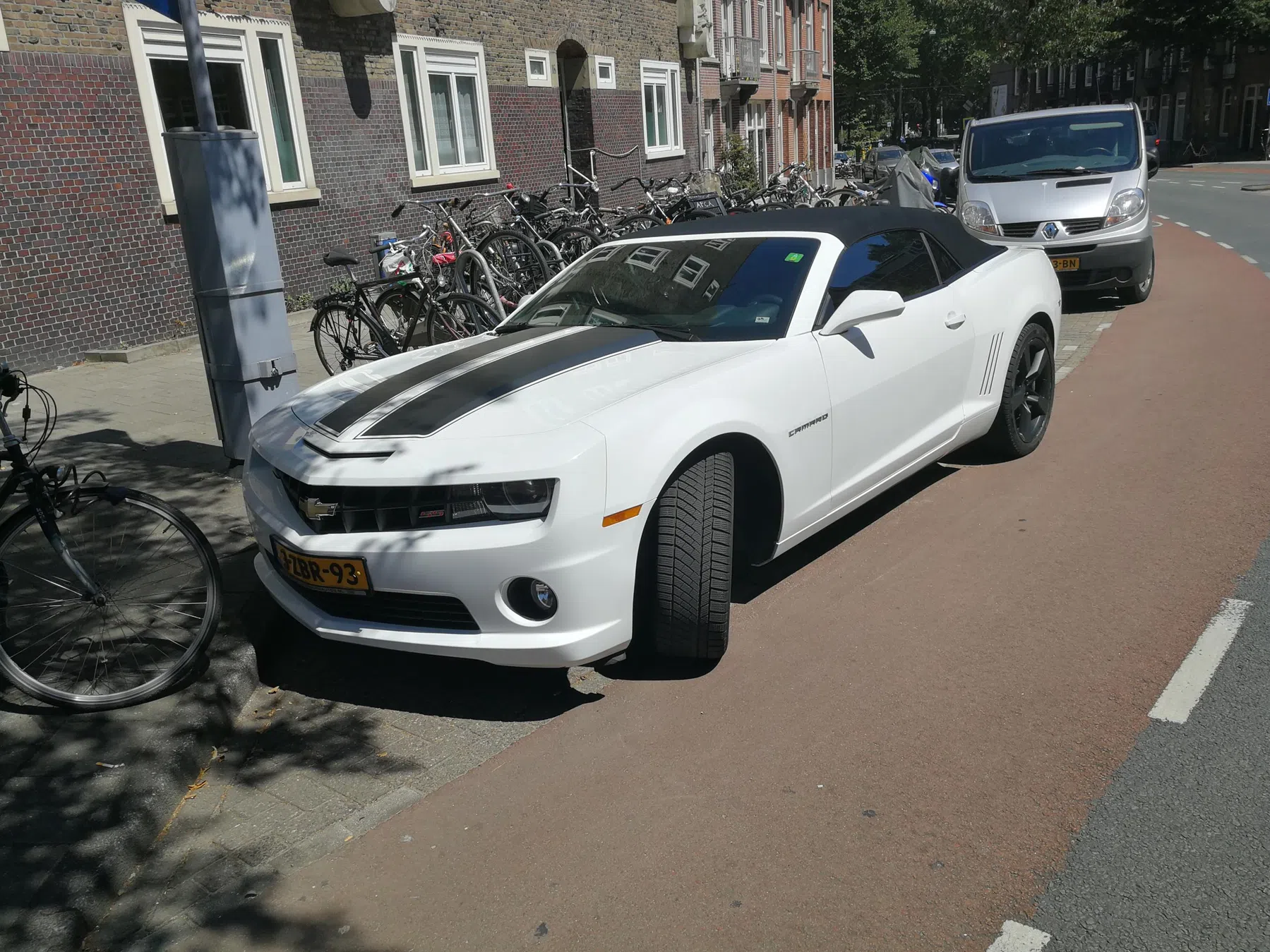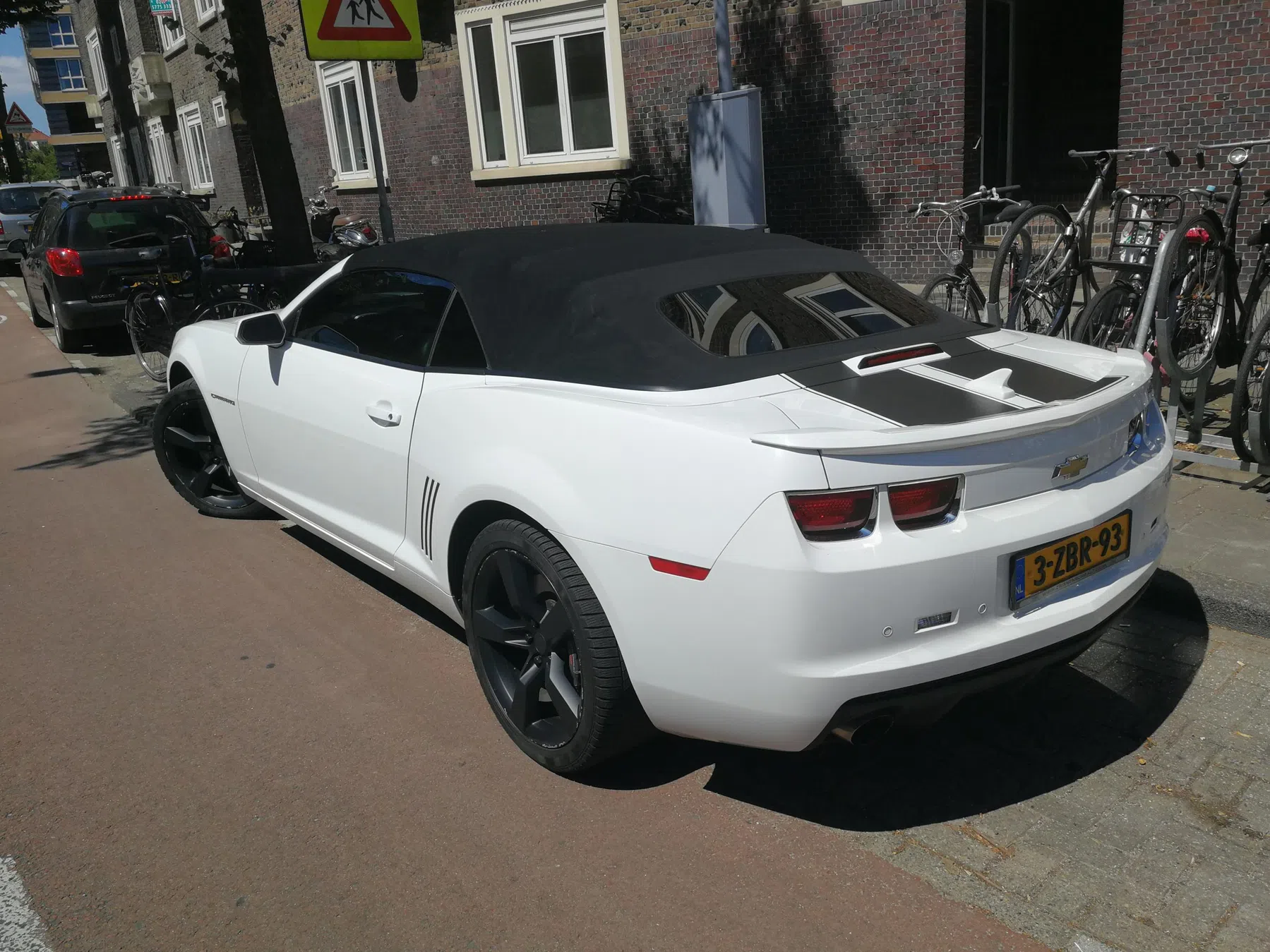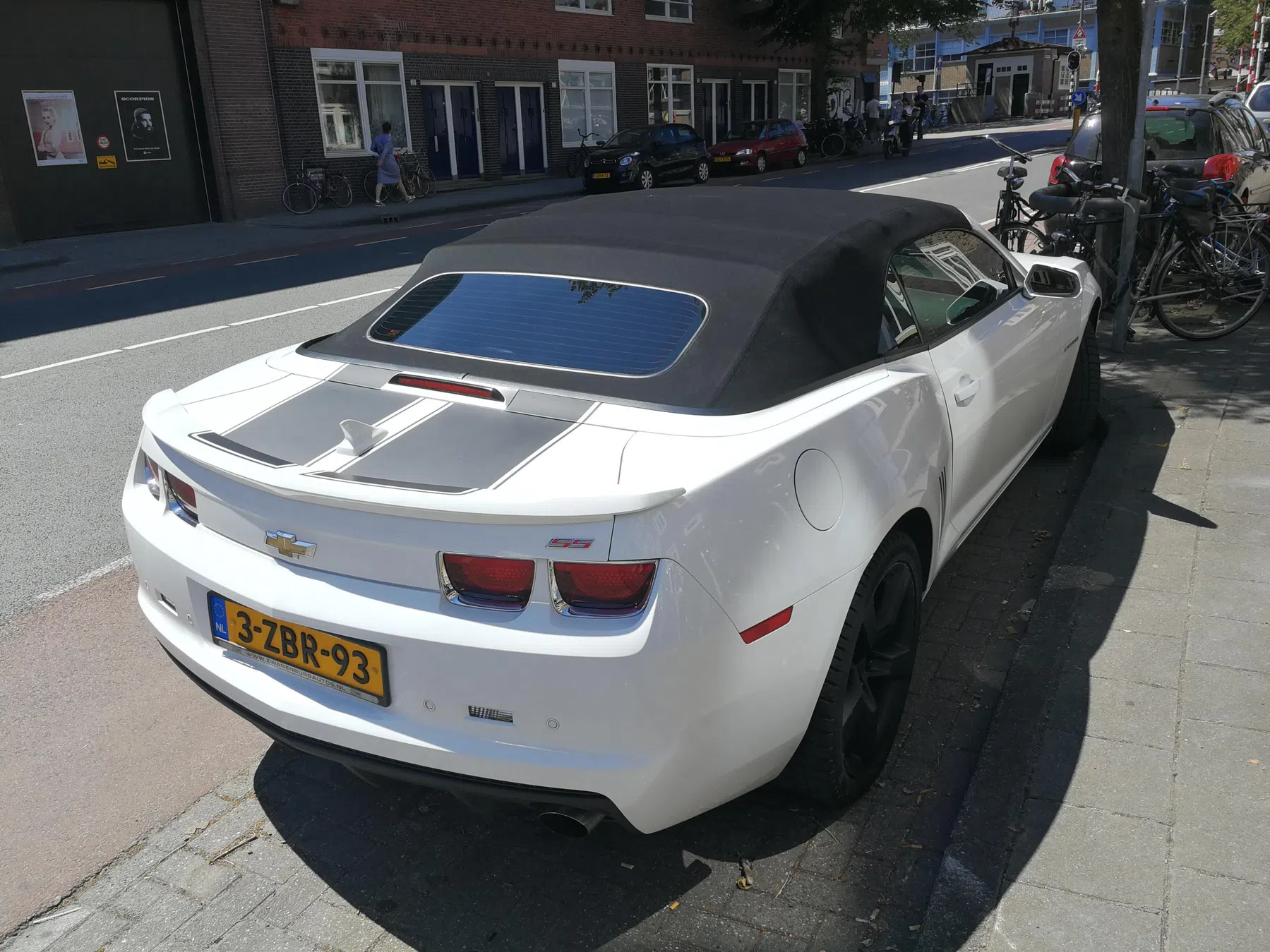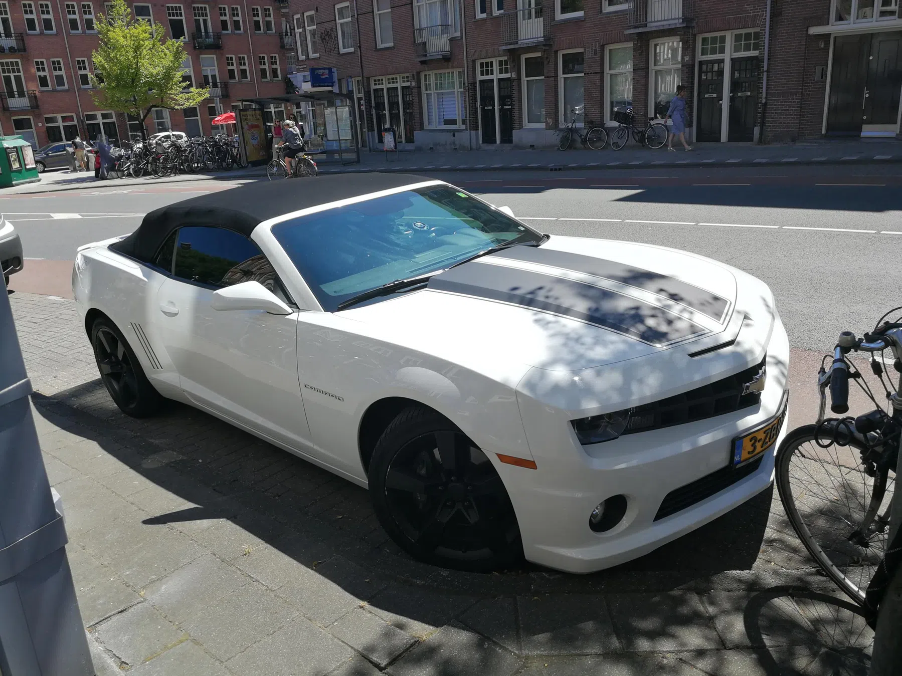 Witte Camaro SS cabrio uit 2011 met zwarte striping, gezien in de Staatsliedenbuurt, Amsterdam. Zat nog niet eens een minuut in de bus, toen ik de Camaro zag. Vond t zeker waard om de Camaro te spotten.