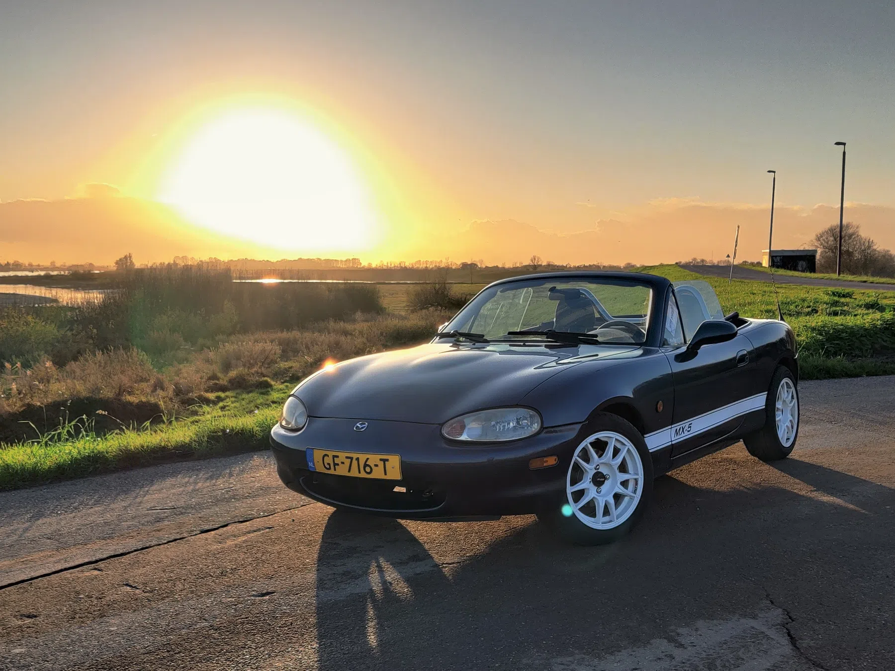 Ik heb deze MX5 nu zo'n 2,5 jaar en heb em redelijk aangepast, dus vind het leuk om wat recente foto's te uploaden. Ik kocht hem toen hij helemaal stock was, op de radio en uitlaat na. Nu heeft hij gekregen: Motec Velgen, Toyo Proxes banden, nieuwe OEM remschijven en EBC remblokken, een nieuwe softtop een wax+polijstbeurt en strepen om hem sneller te maken :P